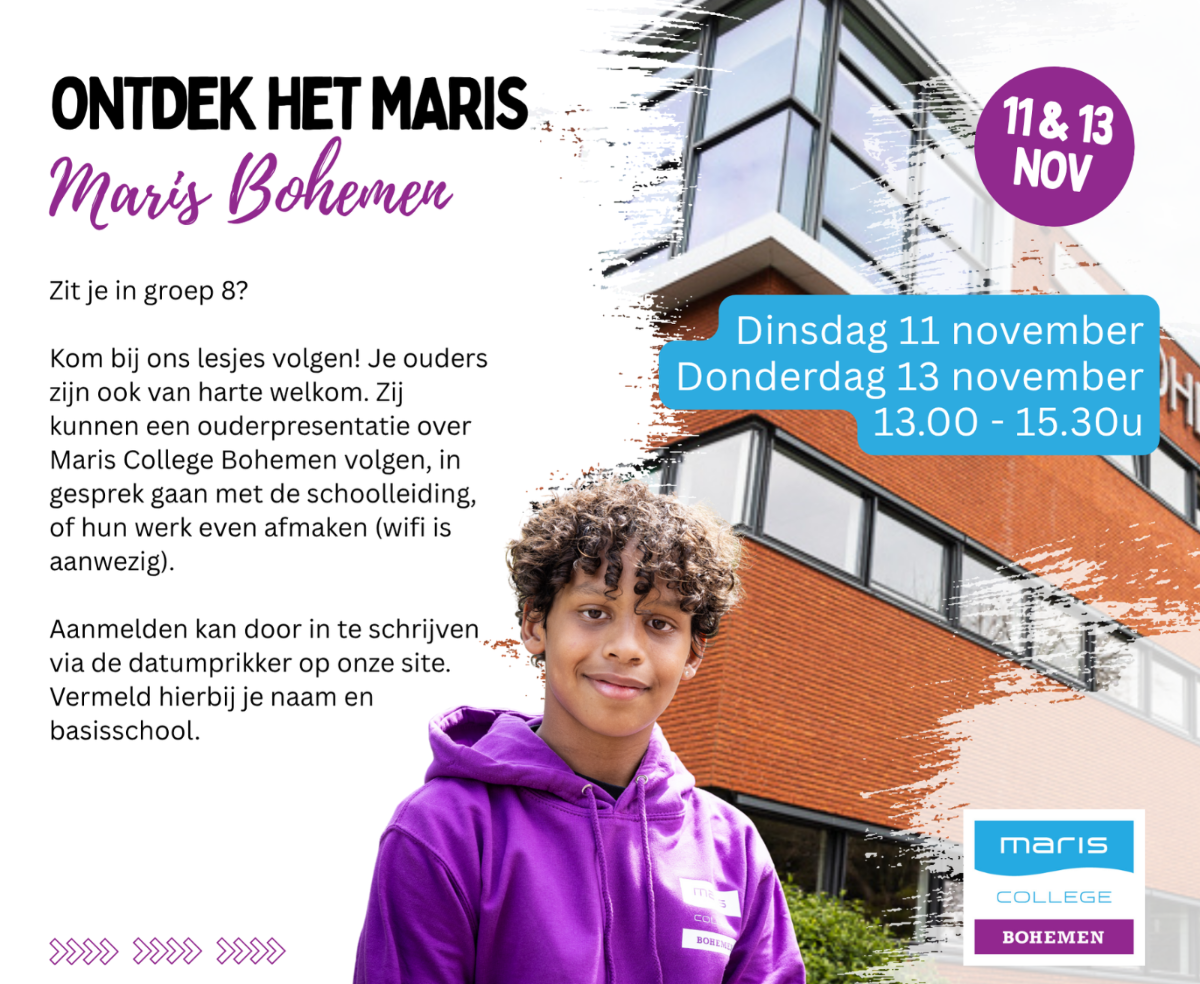 Zit je in groep 8? Kom bij ons op 11 of 13 november lesjes volgen! Je ouders zijn ook van harte welkom. Zij kunnen een ouderpresentatie over Maris College Bohemen volgen, in gesprek gaan met de schoolleiding, of hun werk even afmaken (wifi is aanwezig).